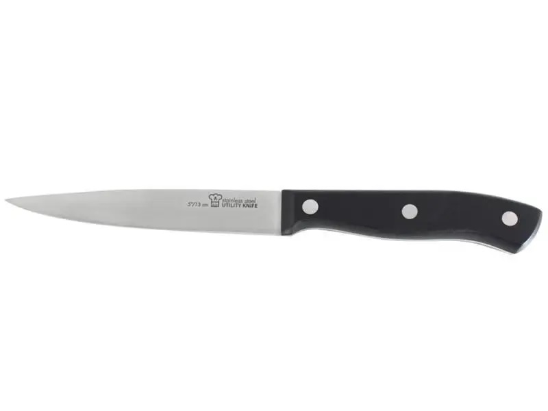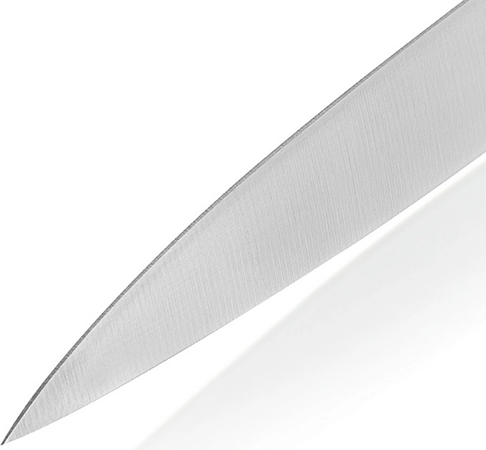 Універсальний кухонний ніж Aurora з прямим лезом і гострим кінчиком допоможе швидко нарізати продукти, нашаткувати зелень, а також виконати іншу роботу з приготування страв.