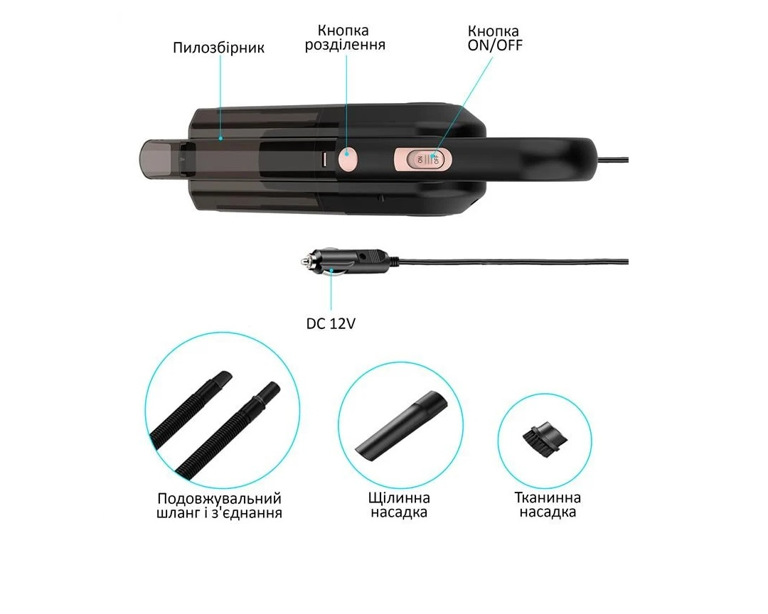 У комплекті з пилососом йдуть три насадки: для пилу і глибокого очищення. З їх допомогою можна ефективно очищати будь-яку частину автомобіля — будь то багажник чи водійське сидіння. Все сміття потрапляє в прозорий контейнер місткістю 0, 7 літри, який легко знімається і швидко спорожняється.