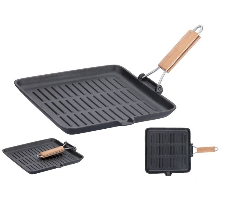 Тяжелая квадратная сковорода с индукционным дном и съемной деревянной ручкой. Изготовлена из чугуна, прокаленного в растительном масле при очень высокой температуре, вследствие чего поверхность сковороды получила антипригарные свойства.