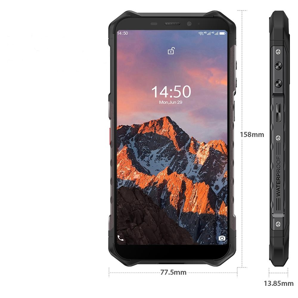 Дисплей 5.5"(1440x720) IPS, процесор 8-ядерний MediaTek MT6762, вбудована пам'ять 64 Гб, оперативна пам'ять 4 Гб, ОС Android 10, слот для карт пам'яті microSD до 256 Гб, камера 13 Мп + 2 Мп, фронтальна камера 5 Мп , 4G, Wi-Fi, NFC, Bluetooth, GPS, стандарт захисту IP69K, Face-ID, сканер обличчя, акумулятор 5000 мАг