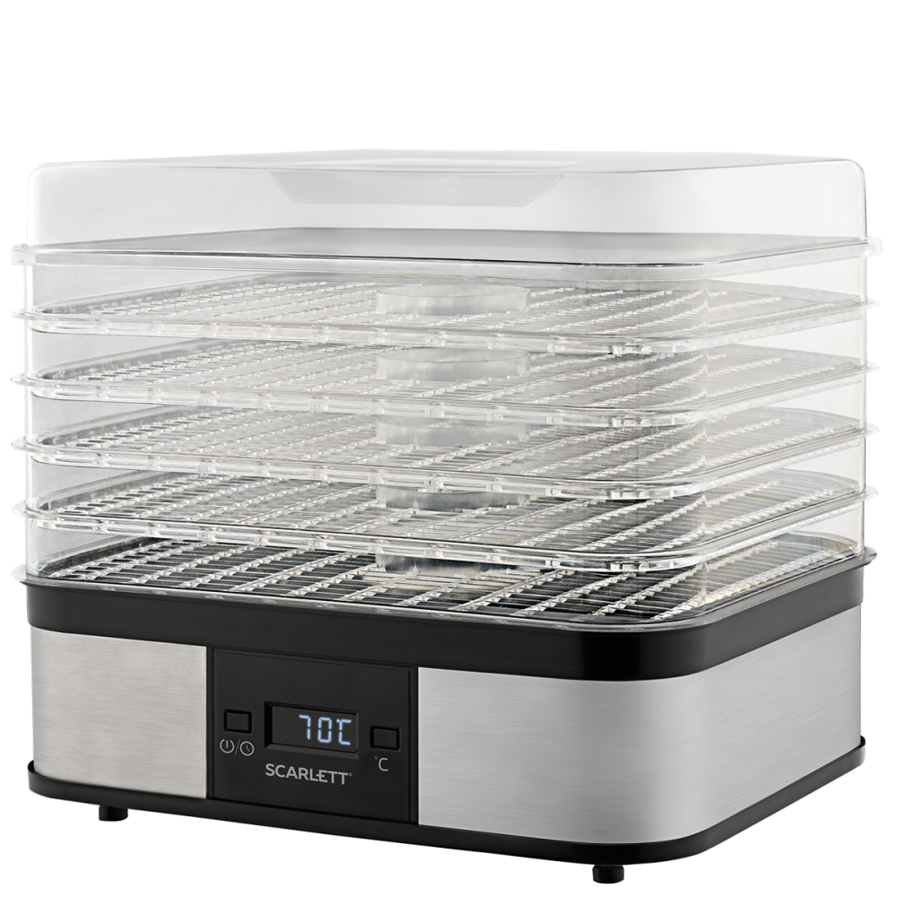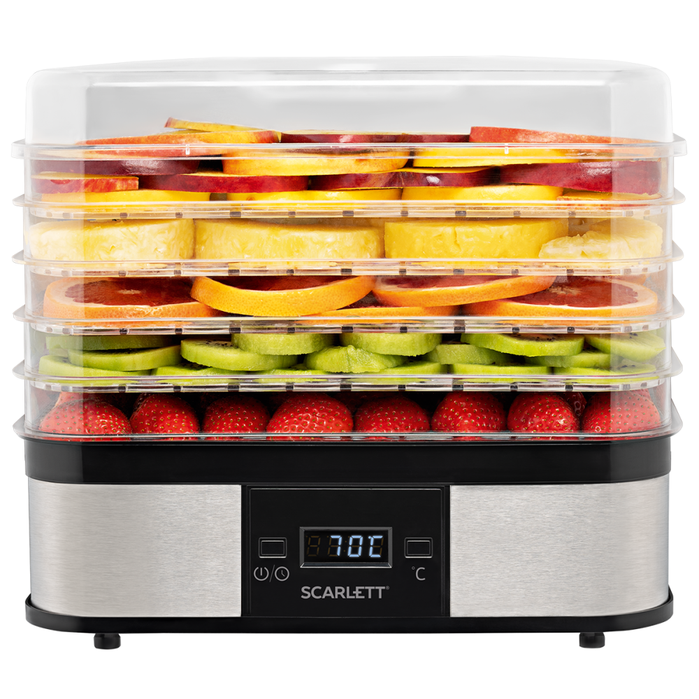 В сушке SC-FD421T19 предусмотрены: электронная панель управления с таймером для установки нужного времени сушки продуктов; 5 прозрачных поддонов c максимальной загрузкой до 1 кг. каждый; регулировка температуры от 40 до 70°С; встроенный вентилятор для равномерной сушки продуктов.