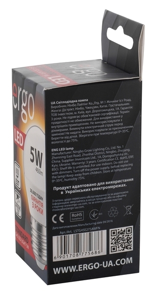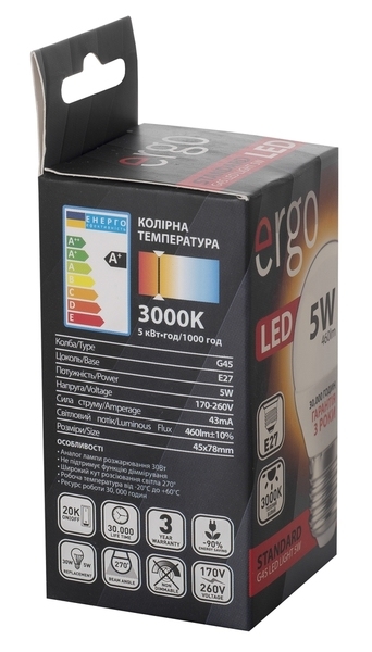 Светодиодная лампа Ergo Standard G45 E27 5W 220V 3000K Теплый Белый