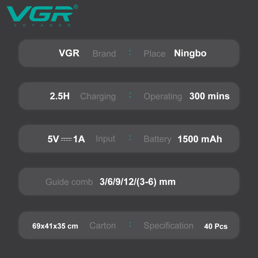 VGR V-111 — це багатофункціональний набір 5 в 1, який поєднує в собі тример для бороди, вусів, волосся, носа та вух. Ідеальний вибір для тих, хто цінує акуратність, комфорт і стильний вигляд щодня.