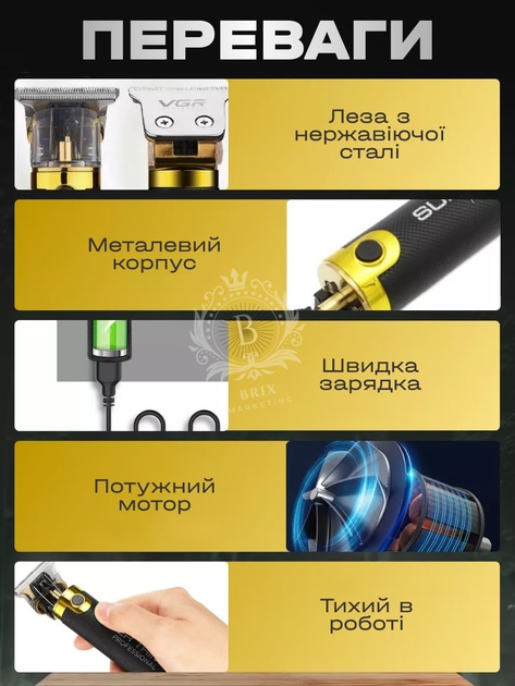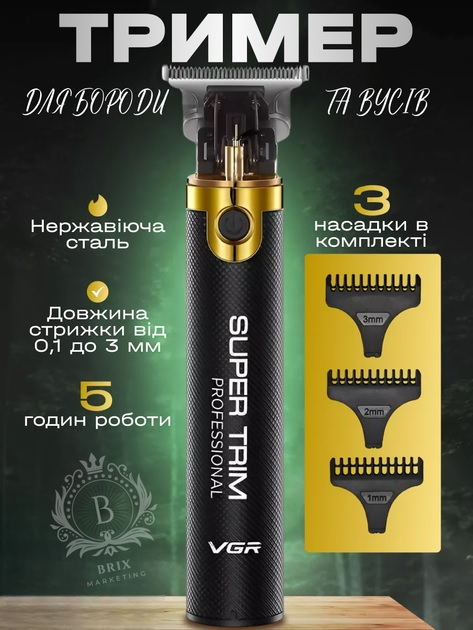 Бездротова машинка триммер VGR V -082 поєднує в собі машинку для стрижки волосся та бороди зі змінними 3 насадками (1 мм, 2 мм, 3 мм). Використовуючи сам триммер без насадки, ви зможете створити рівні контури стрижки, підголити баки або підбрити шию.