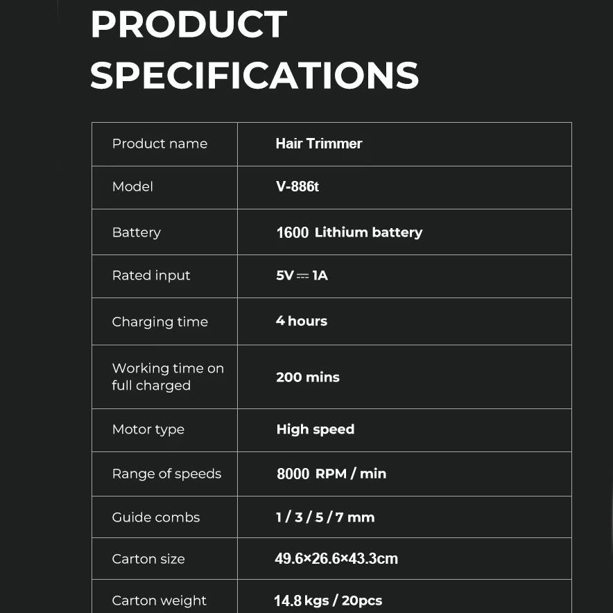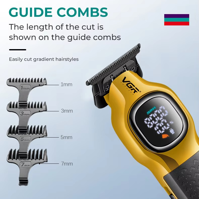Тример VGR V886T– професійна машинка для точної стрижки та моделювання. Високошвидкісний мотор 8000 об/хв та керамічне лезо з металу забезпечують плавний та стабільний зріз. Літієва батарея 1600 мА працює до 200 хвилин, LED-дисплей відображає оберти, заряд і індикатор мастила. USB-зарядка та зарядна база роблять пристрій зручним як для дому, так і для салону. У комплект входять чотири насадки 1, 3, 5, 7 мм для різних технік стрижки.
