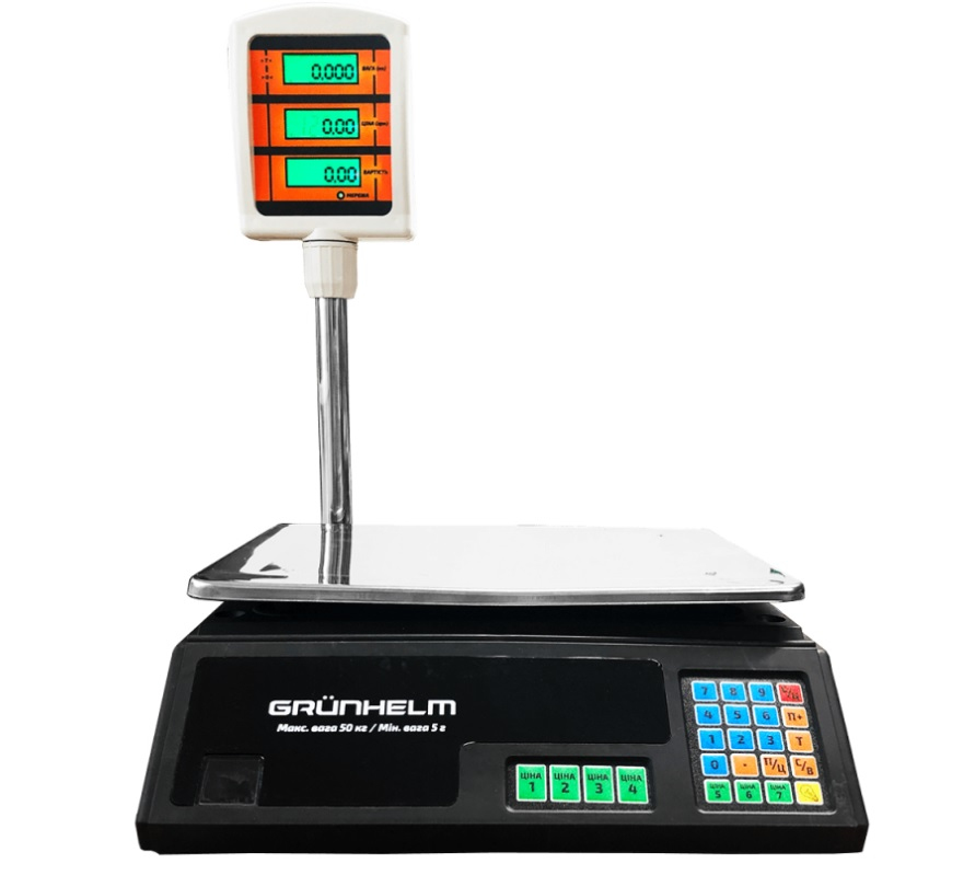 Торгові ваги GRUNHELM GSC-050 настільного зразка керуються за допомогою кнопок, де також можна відтарити або обнулити показники. На цифоровому дисплеї відображено вагу, ціну та вартість з кількістю символів 6/5/5. Металева платформа розмірами 230х330 мм витримує вагу до 50 кг. Ваги працюють від звичайної мережі або від вбудованного акумулятора, кабель при цьому можна від'єднати. Це оптимальний вибір для продавця або робітника складу.