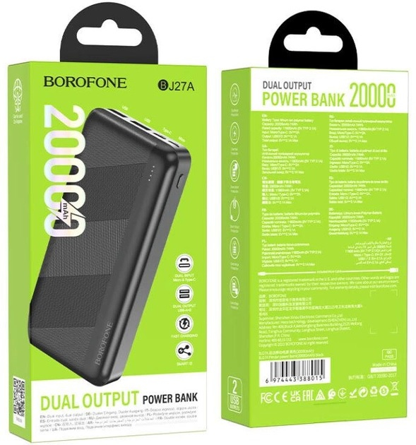 Borofone BJ-27A Pindar Power Bank - зовнішній акумулятор, який здатний продовжити робочий час гаджетів. Завдяки своїй компактності він легко поміститься в сумці або портфелі, при цьому не займаючи багато місця, і в потрібний момент завжди буде під рукою. Power Bank Borofone BJ27А досить потужний і надійний, що гарантує повноцінну зарядку планшета, смартфона, плеєра, фотоапарата або будь-якої іншої техніки, сумісної за характеристиками з портативним зарядним пристроєм.