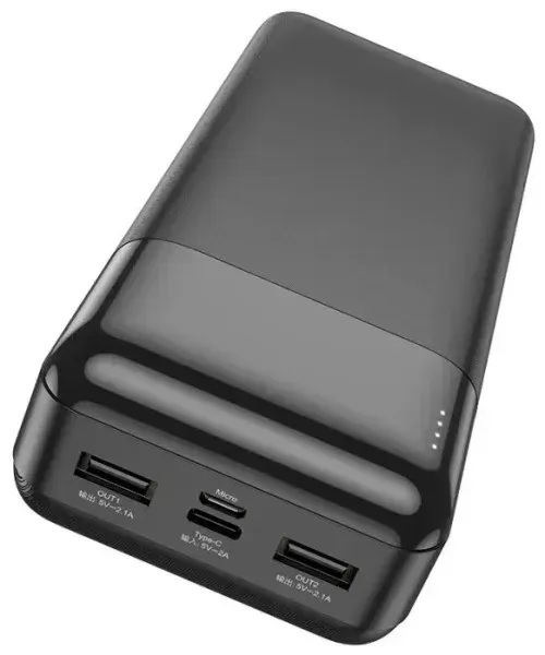 PowerBank HOCO J72B з ємністю 30000mAh забезпечує великий запас енергії для тривалого використання смартфона, планшета чи інших портативних пристроїв. Наявність двох USB виходів дозволяє заряджати кілька гаджетів одночасно, а порти Type-C та MicroUSB дозволяють зручно підбирати спосіб підзарядки самого повербанка. Завдяки стабільній подачі струму пристрій забезпечує безпечне та рівномірне живлення, а індикатор рівня заряду допомагає контролювати залишок потужності. Міцний корпус захищає від ударів та подряпин, що робить повербанк надійним супутником у дорозі.