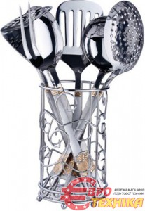 7 предметів: вилка для м'яса, картоплем'ялка, шумівка, черпак, кухонна лопатка, ложка і підставка у вигляді корзини, матеріал - нержавіюча сталь