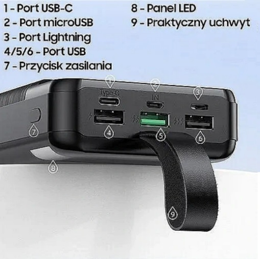 Ця портативна батарея ідеально підходить для людей, яким потрібен доступ до живлення поза приміщенням у будь-якій ситуації. Незалежно від того, чи ви в кемпінгу, чи використовуєте сонячну енергію, цей павербанк забезпечить вас необхідною енергією. Має акумулятор ємністю 30 000 мАг, що дозволяє багаторазово заряджати мобільні пристрої. Завдяки цьому вам більше не доведеться хвилюватися про розрядження акумулятора смартфона, планшета чи іншого мобільного пристрою. Світлодіодний дисплей Зверніть увагу на додаткову функцію портативного джерела живлення - світлодіодний дисплей, розташований у верхній частині пристрою. Це практичне рішення дозволяє постійно відстежувати стан заряду батареї powerbank, що особливо важливо під час тривалих поїздок або відпусток. Завдяки цьому вам не доведеться турбуватися про раптову розрядку пристрою в найменш відповідний момент. Світлодіодний дисплей простий у використанні та дозволяє контролювати рівень заряду павербанка та планувати зарядку, що важливо, коли ви щоденно використовуєте багато мобільних пристроїв. Зарядні порти USB, USB-C і Lightning Цей портативний зарядний пристрій оснащено різними зарядними портами, включаючи USB, USB-C і Lightning, що дає користувачеві можливість заряджати різноманітні пристрої. Завдяки наявності цих портів заряджання відбувається швидко та легко, що дозволяє швидко заряджати ваші пристрої, коли вам це потрібно. Крім того, портативний джерело живлення забезпечує зручність і комфорт в зарядці ваших пристроїв, незалежно від того, де ви знаходитесь - вдома, в офісі або на відпочинку. Завдяки цьому ви завжди можете використовувати свої пристрої, коли вам це найбільше потрібно, не турбуючись про брак енергії. Безпека та зручність в одному Powerbank оснащений відповідним захистом від перенапруги, що гарантує безпеку під час заряджання ваших мобільних пристроїв.
