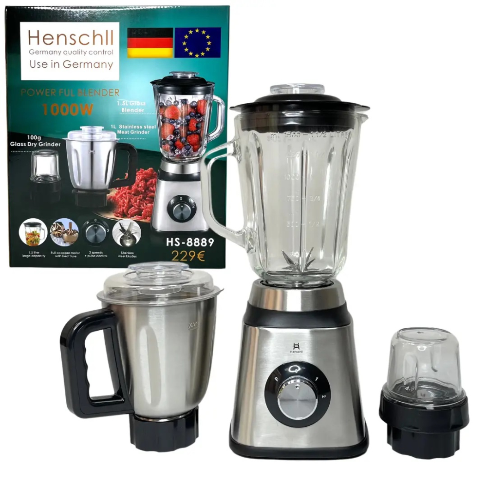 Блендер-кавомолка-м'ясорубка Henschll HS-8889 має потужність 1000 Вт, яка дає змогу швидко та легко змішувати, нарізати, перемелювати та збивати продукти. Завдяки його двом швидкостям і функції пульсування ви можете змінювати швидкість оброблення залежно від потреб інгредієнтів.