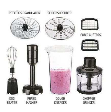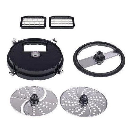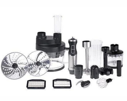 Комплектація: вінчик, насадка для пюре, насадка для нарізки кубиками, тістоміс, подрібнювач, терка для дерунів.