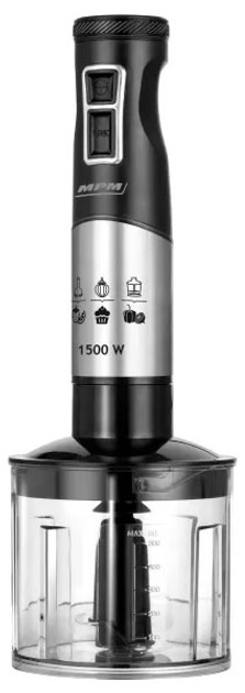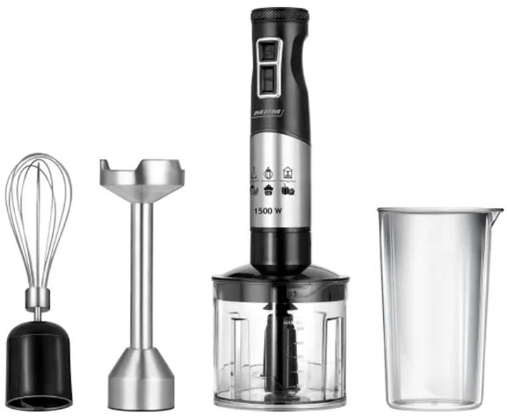 Потужність: 1500 Вт, кількість швидкостей: 9, подрібнювач 500 мл (матеріал лез нержавіюча сталь), вінчик для збивання, мірна чашка з ручкою (700 мл), ніжка з нержавіючої сталі.