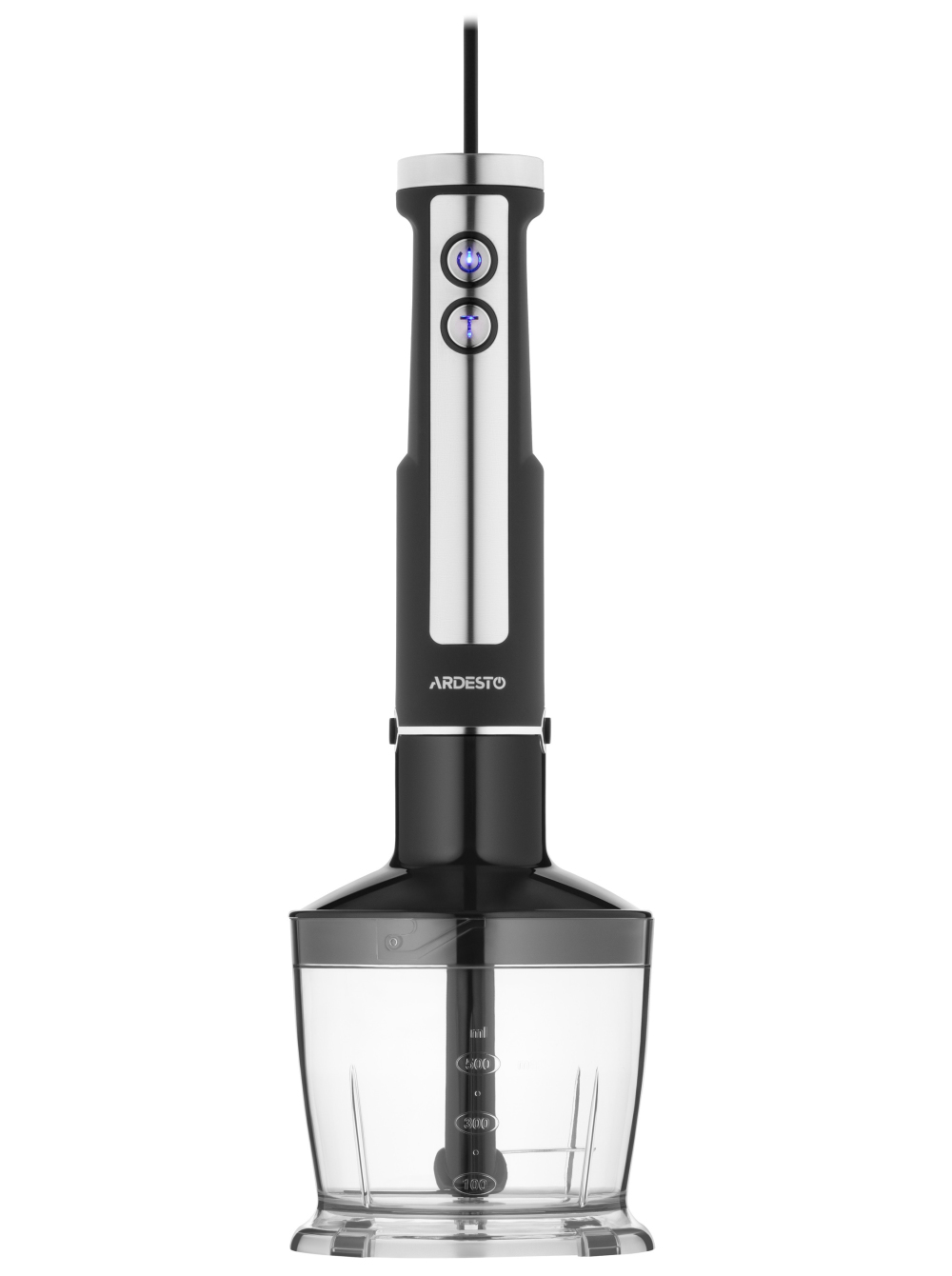 Занурювальний блендер Ardesto HBG-1000BCHP чорно-сріблястого кольору згодиться для швидкого приготування коктейлів, смузі, соків і різноманітних соусів. Оснащений двигуном потужністю 1 000 Вт із низьким рівнем шуму, двома режимами роботи (звичайний і турбо) і п’ятьма швидкостями. До того ж доступні три функції приготування продуктів: змішування, подрібнення, збивання.