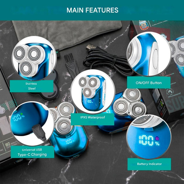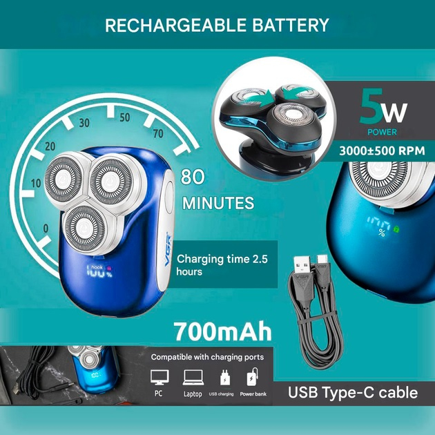 Електробритва VGR V-346 поєднує стиль, зручність і функціональність. Завдяки ергономічному дизайну та трьом роторним головкам вона забезпечує гладке гоління й комфортний догляд за шкірою щодня.