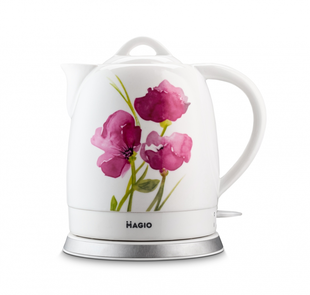 Чайник MG-974 розрахований на 1,5 л, поєднує в собі стильний дизайн з гарною якістю і надійністю. Корпус віготовоен з екологічно чистого матеріалу - кераміки, завдяки цьому вода зберігає свої природні властивості, не містить сторонніх запахів і неприємних присмаків. Кераміка зберігає набагато довше температуру води, а це значить, що його рідше доведеться включати.