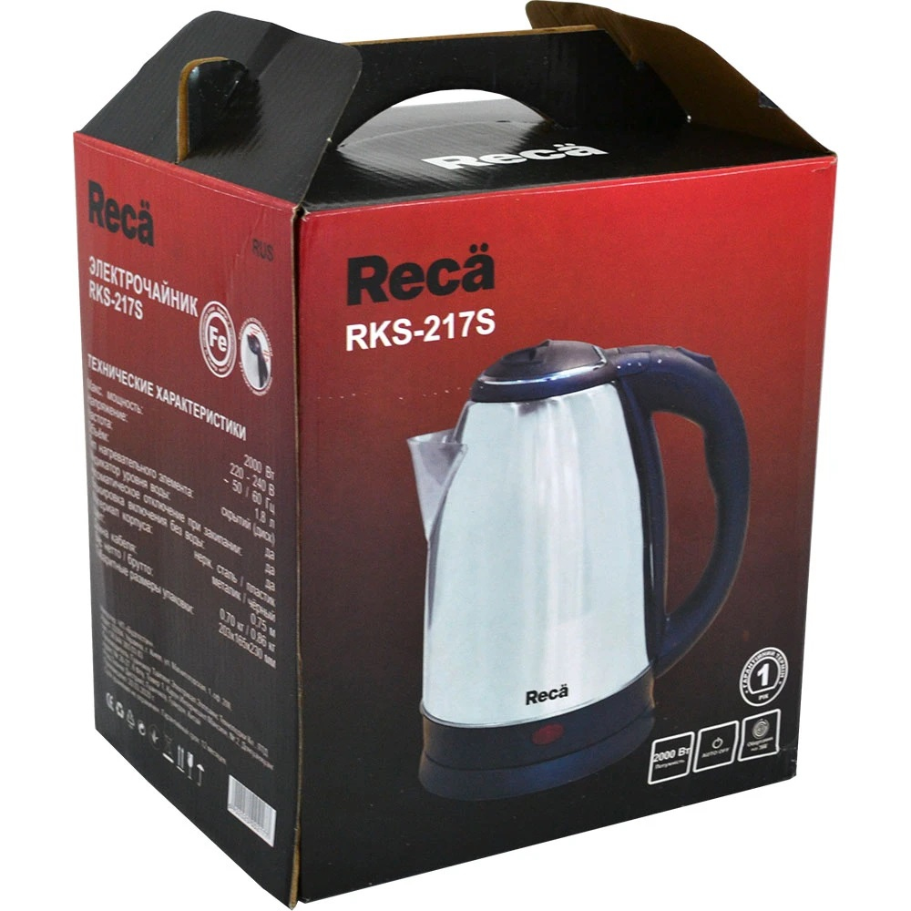 Reca RKS-217S - міцний, безпечний в роботі і простий у використанні електрочайник, на 100 відсотків буде цікавий споживачеві, оскільки зовні виділяється своїм універсальним дизайном, добре виконаної конструкцією з комбінації таких матеріалів, як нержавіюча сталь і пластик, а також довговічний і продуктивний прихований дисковий нагрівач, який гарантує швидку швидкість підігріву.
