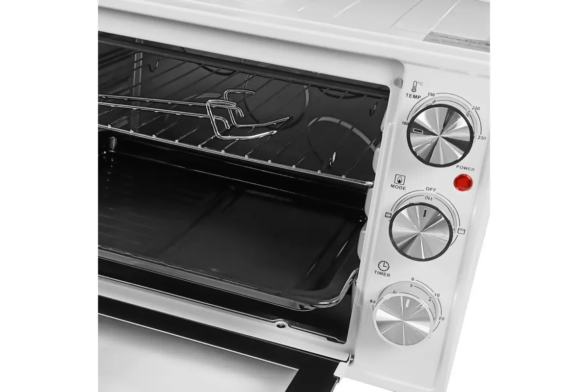Об'єм: 25 л, потужність: 1600 Вт, таймер 60 хв, температурні режими: 100°C, 150°C, 200°C, 230°C, кількість програм: 3 (гриль / запікання / вертел). Матеріал корпусу: емальований метал.