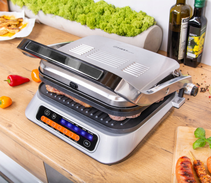 Гриль First FA-5344-3 - це пристрій з притискної конструкцією. Будова цієї техніки має на увазі розміщення їжі між двома пластинами, які затискають для отримання правильної термічної обробки і красивих підсмажених смуг. Така конструкція дає можливість чудово обробити м'ясо, рибу, овочі, зробити бутерброди, хот-доги, закуски.