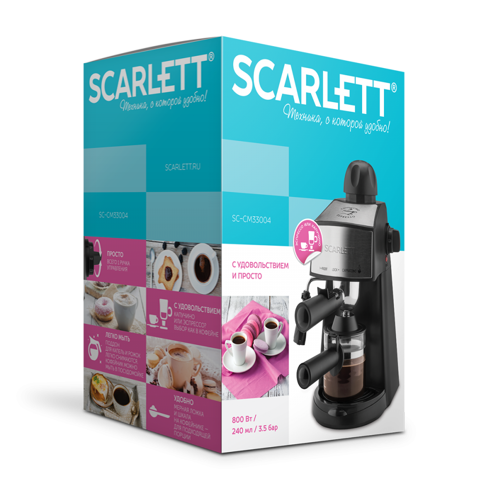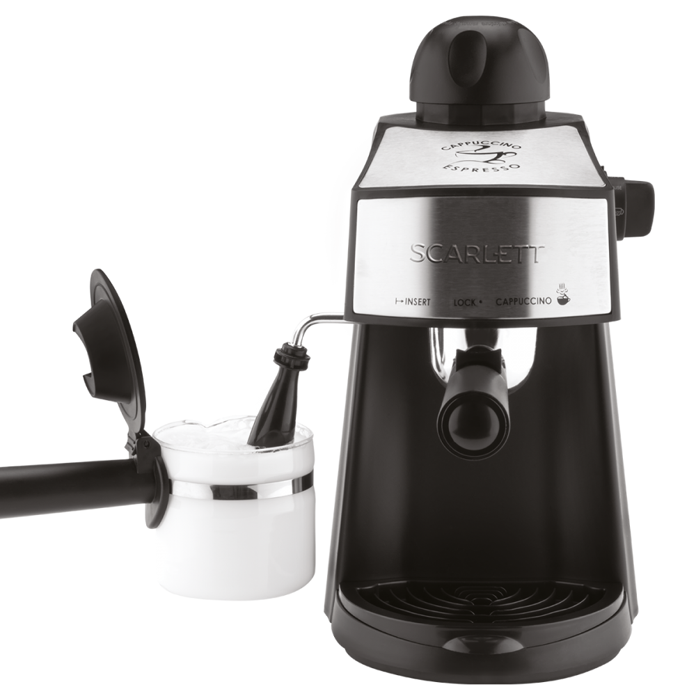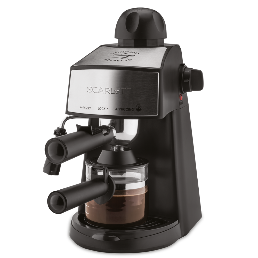 Кавоварка бойлерного типу SC-CM33004 потужністю 800 Ватт оснащена кавником з термостійкого стекла. Класичне поєднання кольорів з металевої декорацією впишеться в будь-який інтер'єр.