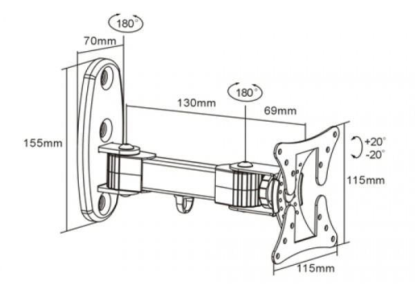 Сумісність (діагональ) від 13 "до 24", стандарт VESA 100x100 мм, максимальне навантаження 30 кг, кут нахилу 20 °, кут повороту 180 °, відстань до стіни 100-230 мм