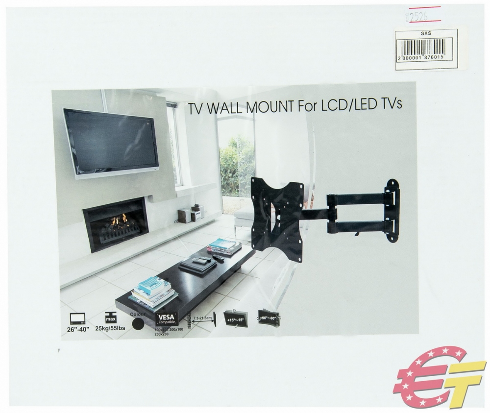 Стандарт VESA 100х100 мм, 200х100 мм, 200х200 мм, сумісний з ТВ 26"-40" дюймів, максимальне навантаження 25 кг, кут нахилу -15º/+15º, поворот 90º
