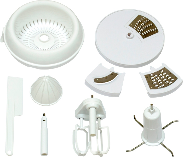 Перетворити трудові будні в свято зможе кухонний комбайн AU 117. В одному приладі Ви купуєте цілу команду працьовитих помічників. Міксер, блендер, соковижималка, подрібнювач потужністю потужність 700 Вт. Кухонний комбайн AU 117 зручний в експлуатації, в ньому просто міняти насадки, ножі, терки, легко мити. Тепер овочеві, фруктові і ягідні пюре, пудинги, коктейлі, домашні соуси, млинці, різноманітні салати, смачні торти і тістечка з ніжним кремом, корисні фреші, а також будь-які страви з м'ясного або рибного фаршу з легкістю будуть з'являтися на Вашому столі і радувати близьких . З кухонним комбайном AU 117 Вас не раз відвідає думка: «Як я обходилася без нього раніше?»