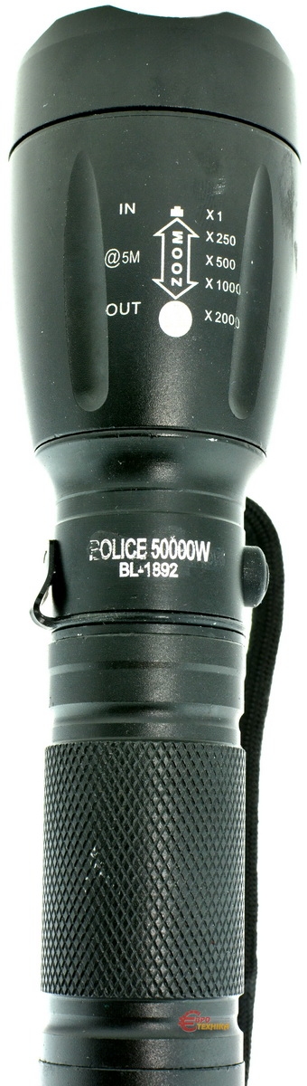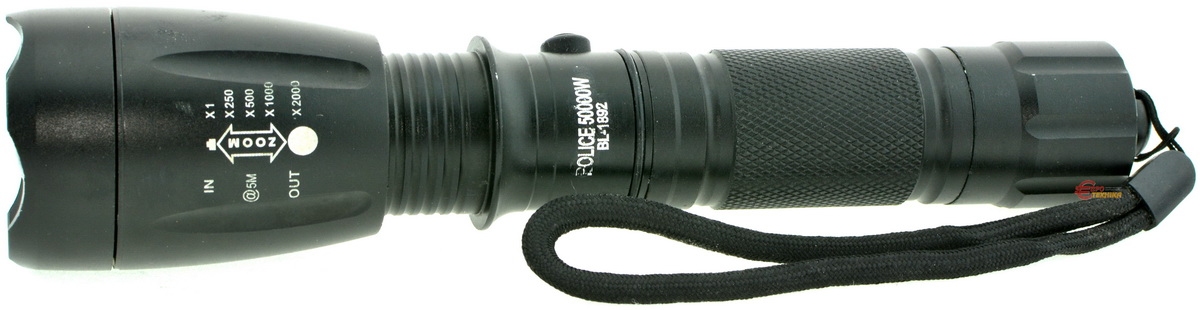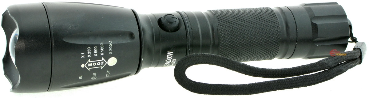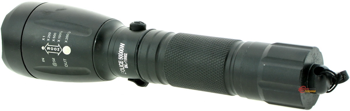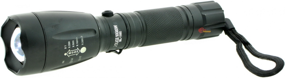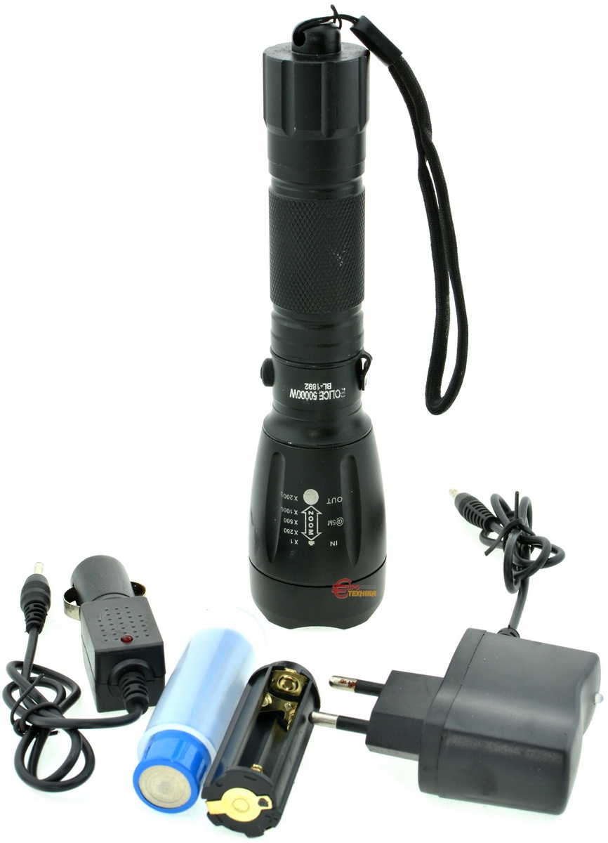 1 LED, алюмінієвий корпус, 5 режимів світіння, фокусування, живлення від акумулятора або 3-х батарейок, зарядний пристрій від 220 В, автомобільний зарядний пристрій