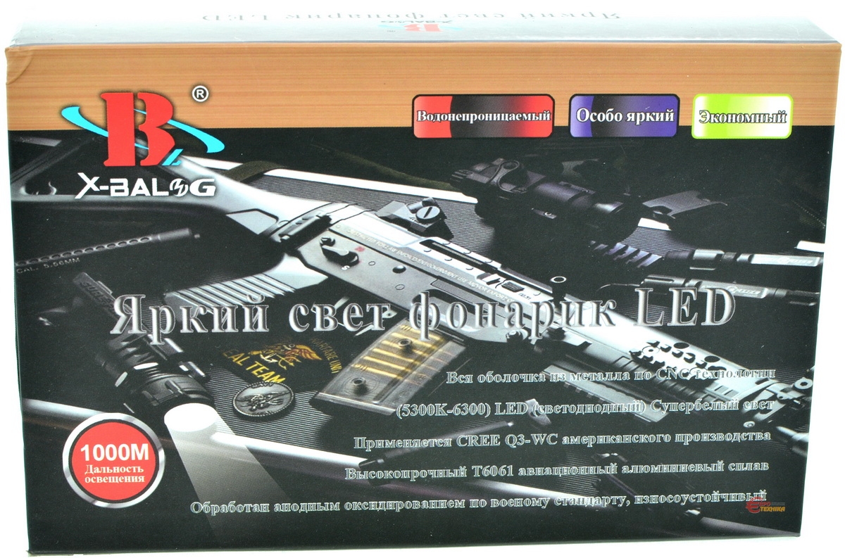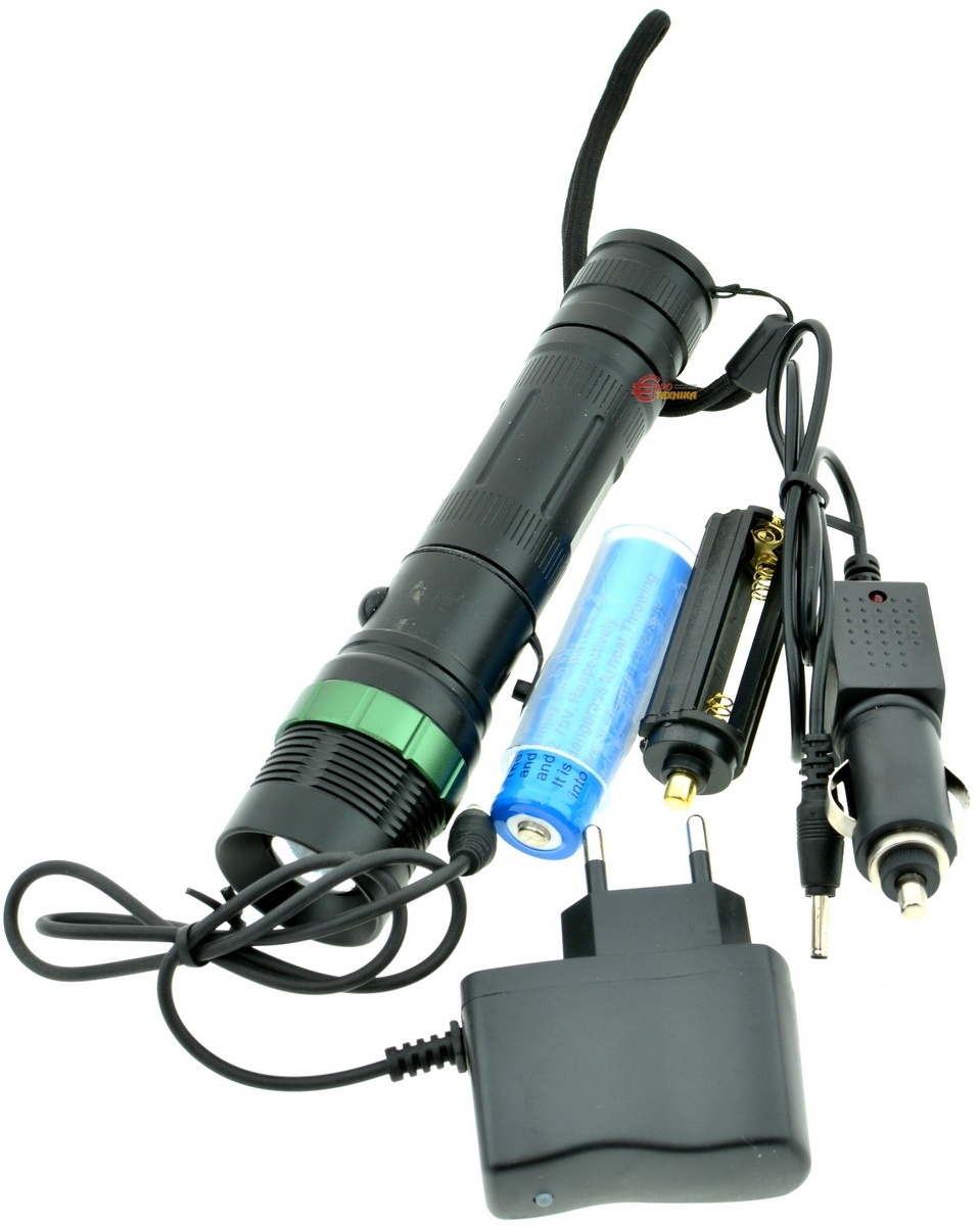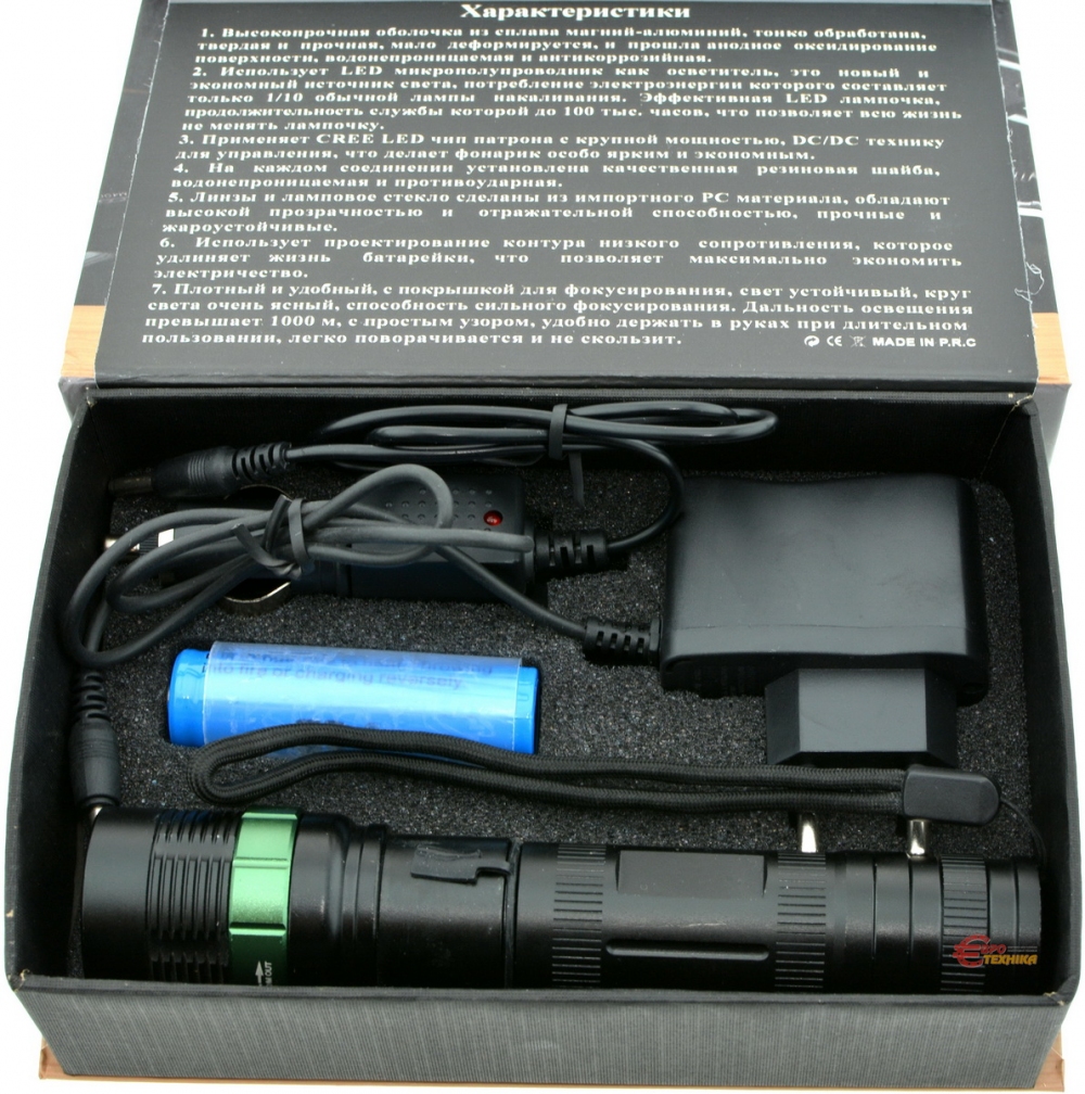 1 Cree LED, алюмінієвий корпус, 3 режими роботи, живлення від акумулятора і 3-х батарейок, зарядний пристрій від 220 В, автомобільний зарядний пристрій, потужність світлового потоку: 150.0000 лм