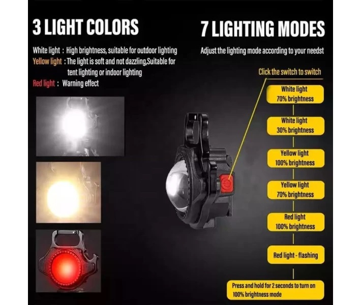 Багатофункціональний туристичний ліхтар із 7 режимами роботи, включаючи ультраяскраве освітлення при утриманні кнопки. Оснащений магнітом для зручного кріплення, працює від акумулятора та заряджається через USB.
