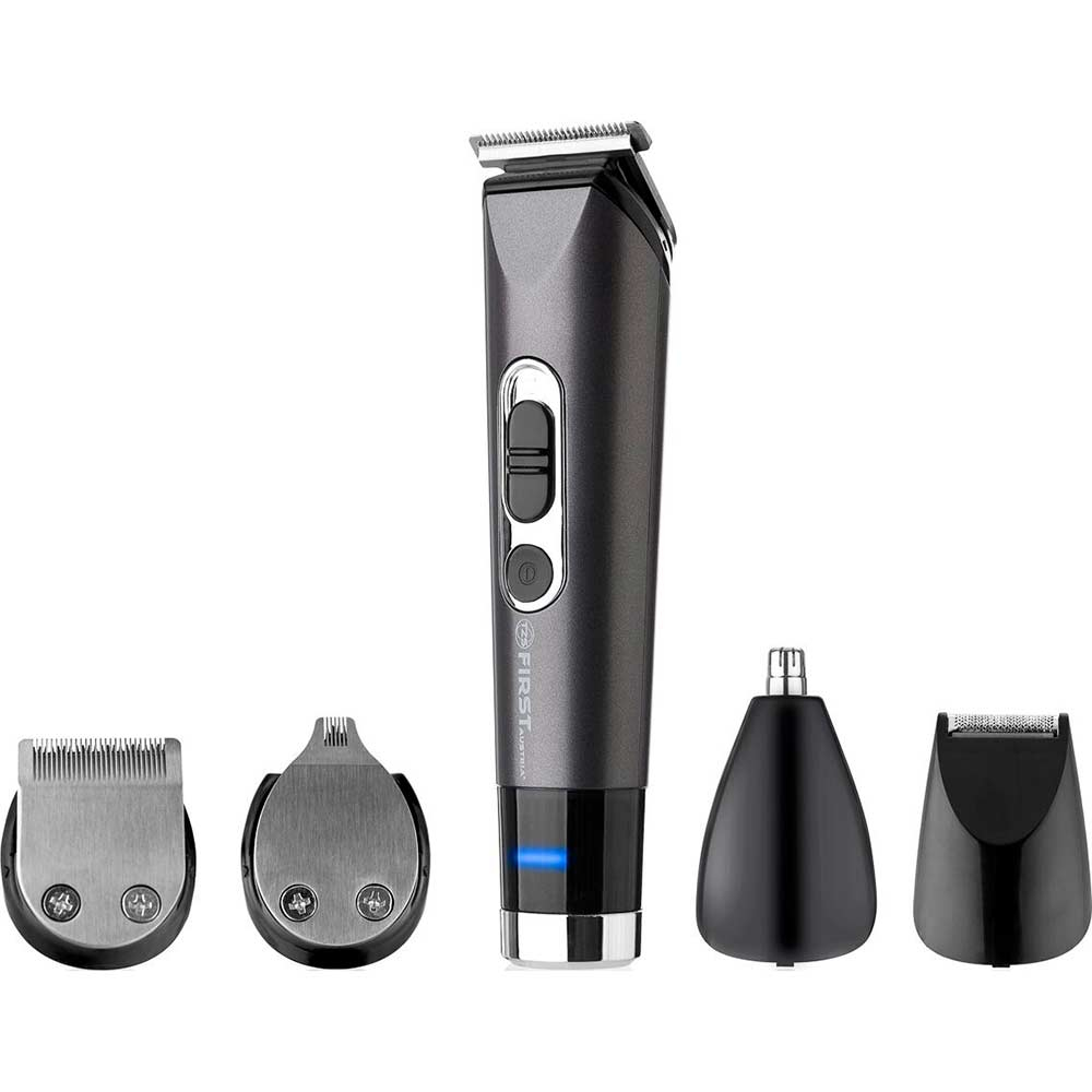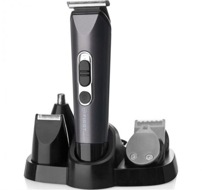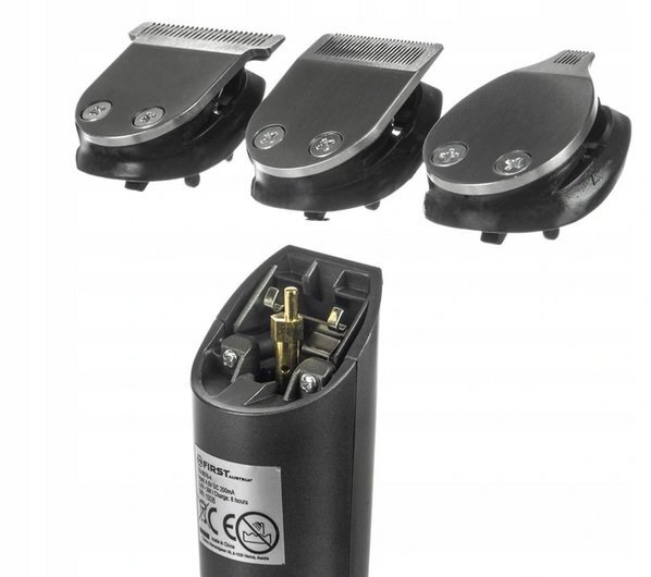 Леза з нержавіючої сталі, потужність 3 Вт, 4 змінні насадки (3, 6, 9, 12 мм), 3 насадки для стригучої головки, 5 змінних головок: для стрижки, Т-подібна для стрижки, для гоління, тример для носа, тример прецизійний, живлення від акумулятора.