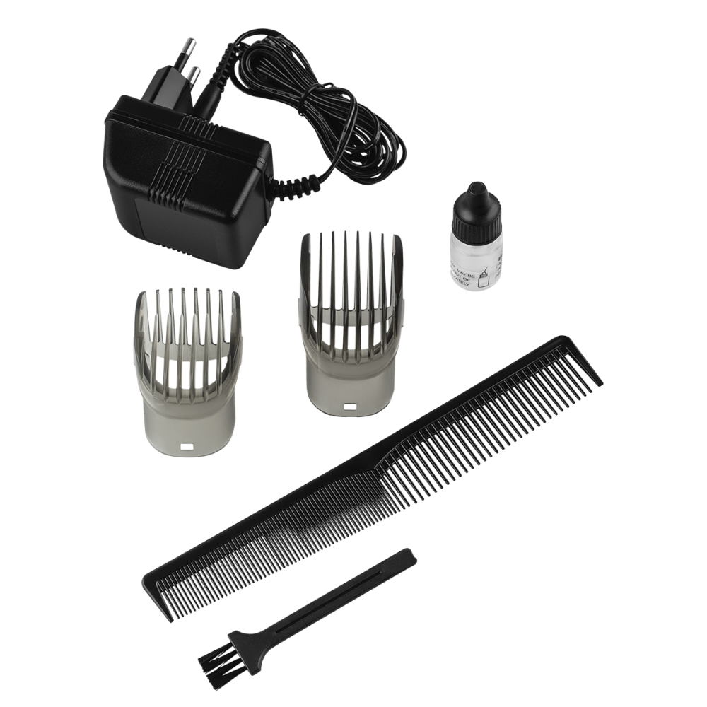 2 в 1 - стрижка волосся і бороди, 2 знімних гребені (1-18 мм), 18 налаштувань для стрижки волосся і бороди, функція філірування, матеріал леза: нержавіюча сталь, живлення: мережа/акумулятор, час роботи від акумулятора: 45 хв, можливість вологої чистки, система легкої чистки, гребінець, ножиці, масло, щітка для чищення машинки