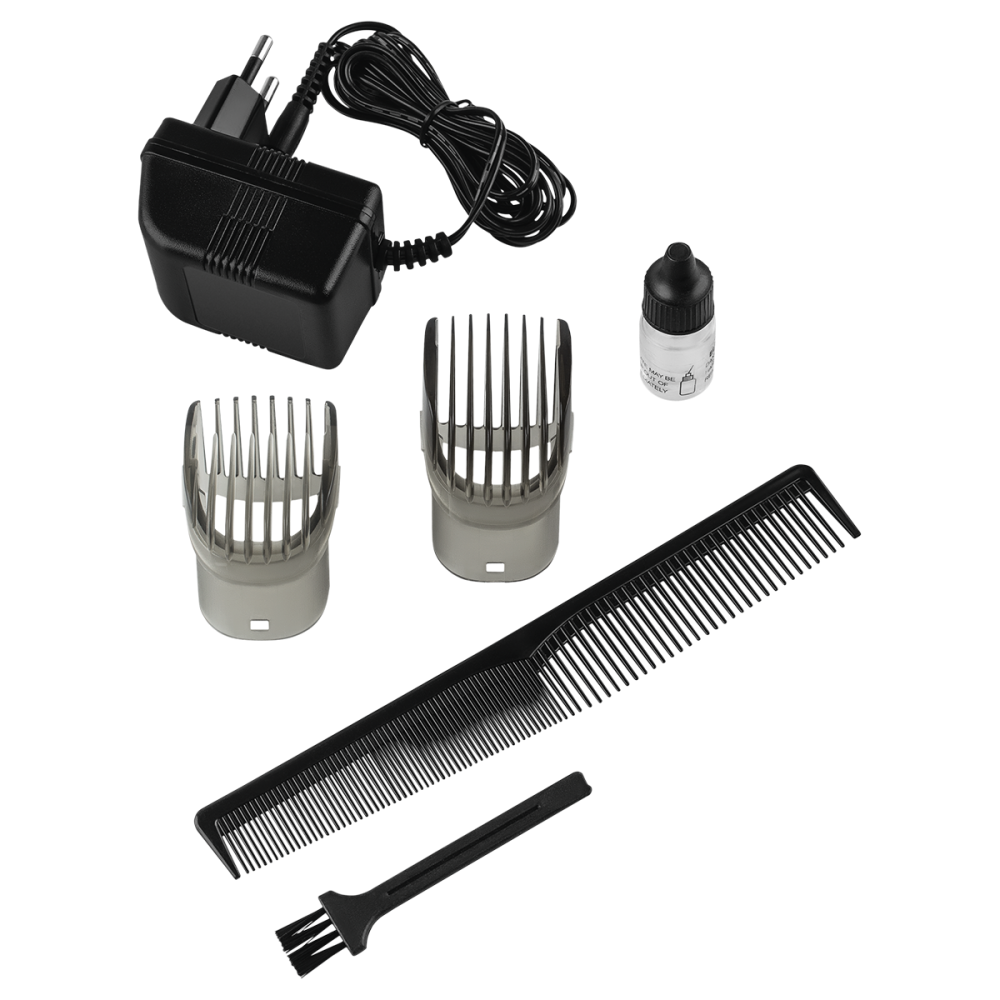 2 в 1 - стрижка волосся і бороди, довжина стрижки: 1-18 мм, 2 насадки (1-9 мм, 10-18 мм), матеріал леза: нержавіюча сталь, живлення: мережа/акумулятор (800 мАг), індикатор заряду, потужність: 8 Вт, час роботи від акумулятора: 45 хв, гребінець, масло, щітка для чищення машинки, довжина кабелю: 1.7 м