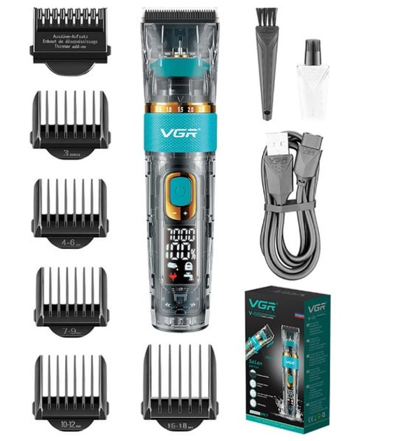- 6 змінних насадок для стрижки: 3 мм, 4–6 мм, 7–9 мм, 10–12 мм, 16–18 мм та "thinner add-on" (насадка для філування)