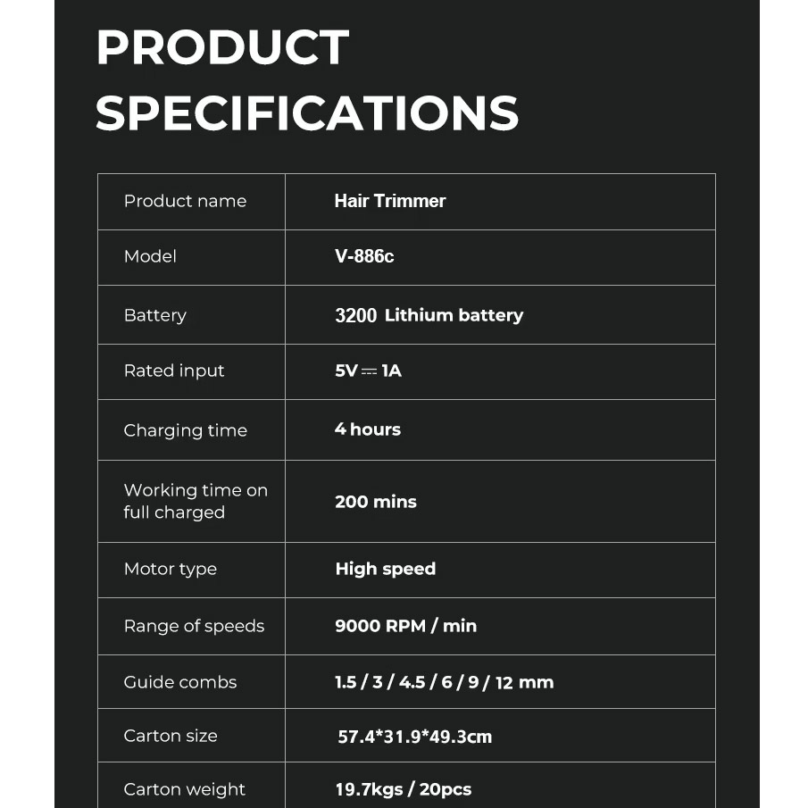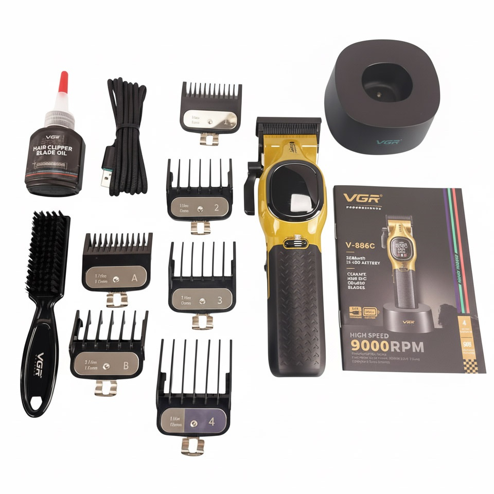 Акумуляторна машинка для стрижки VGR V-886C GOLD&— професійний інструмент з потужним двигуном 9000 оборотів за хвилину, керамічним лезом та DLC-покриттям, що забезпечує рівний та чистий зріз. Літій-іонний акумулятор 3200 мА гарантує до 200 хвилин автономної роботи. LED-дисплей відображає заряд, швидкість та стан пристрою. Зручний гумовий корпус полегшує роботу, а металеві насадки забезпечують точну довжину стрижки. На фото підтверджено заявлені параметри: 9000 RPM, батарея 3200 мА, час роботи 200 хвилин.