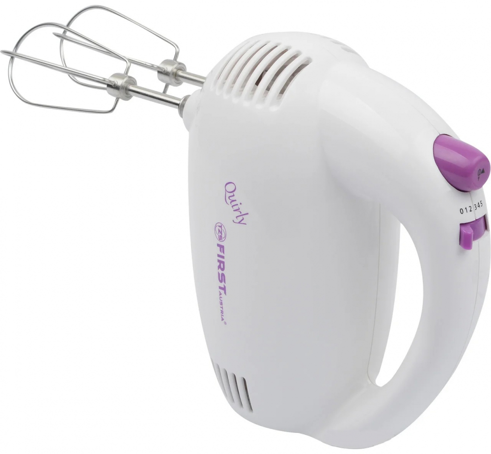 Ергономічна ручка міксера First FA 5262-4 зручно сидить в руці. Біля неї знаходиться перемикач швидкісних режимів, що дозволяє вибрати інтенсивність збивання. Всього є 5 швидкостей. У набір з міксером входить одна пара насадок - віночки. Вони встановлюються в отвори на нижній частині корпусу. Для вилучення насадок передбачена кнопка «eject», тому немає ніякої необхідності витягати їх силою і бруднити руки.