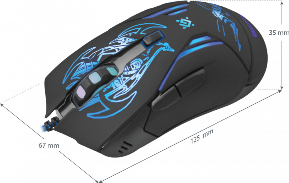 Тип сенсора: оптичний, роздільна здатність: 800/1800/2400/3200 DPI, кількість кнопок: 6 + колесо-кнопка, підсвітка, розміри: 6.7 x 3.5 x 12.5 см, килимок в комплекті