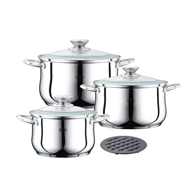 Набір каструль Peterhof PH-15857 складається з 7 предметів – три каструлі з кришками та бакелітова підставка. Весь посуд укомплектований кришками з паровідведенням. Каструлі виконані з якісної харчової нержавіючої сталі. Дно - капсульне індукційне тепло, що рівномірно розподіляє. Посуд призначений для щоденної експлуатації, дуже зручний для консервації. Термостійкі скляні кришки з паровідведенням. Каструлі при правильній експлуатації прослужать довго, не потемніють, не піддаються корозії та потьмянінню. Каструлі придатні всім видів плит, зокрема і індукції.