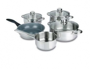 Набір посуду з 8 предметів з нержавіючої сталі, металеві ручки, скляні кришки з отворами для випуску пару, комплектність: каструля з кришкою 20 см, сковорода з керамічним антипригарним покриттям з пластиковою ручкою 24 см., каструля з кришкою 18 см., каструля з кришкою 24 см., ковш без кришки 16 см. Можливо застосовувати в духовці (окрім сковороди).