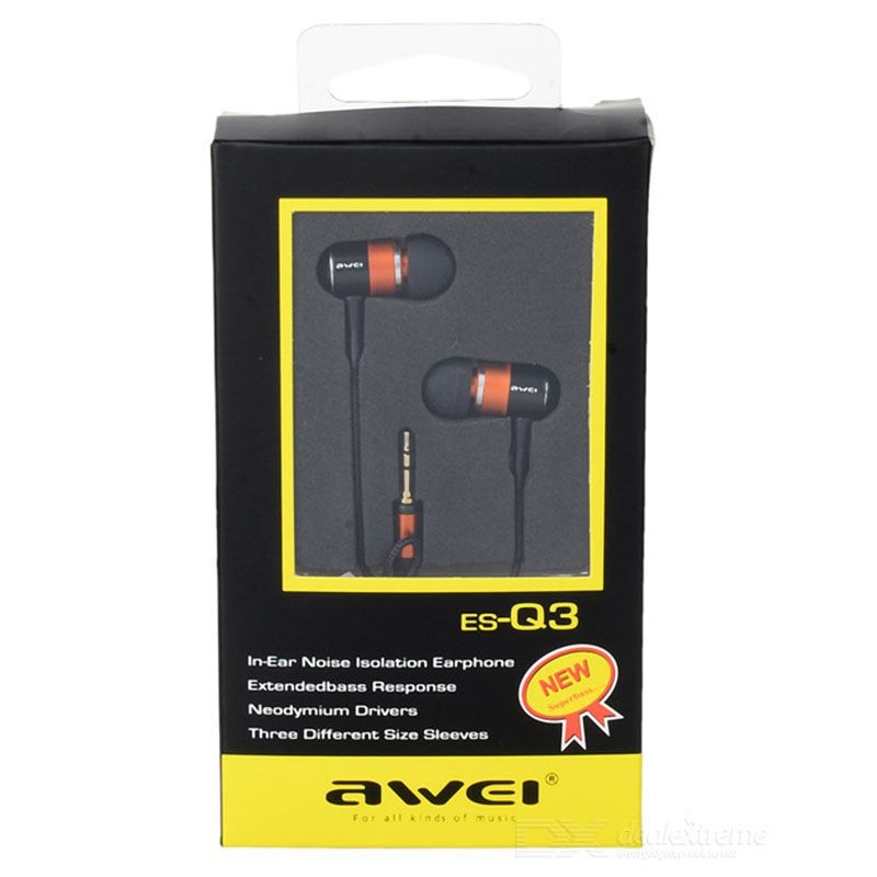 Навушники внутрішнього типу AWEI ES-Q3 виконані з високоякісних матеріалів і мають преміальний дизайн. Основа аксесуара виготовлена з металу, що робить її міцною і довговічною. Міцний кабель довжиною 1.2 м має тканинний плетіння й забезпечує тривалий термін експлуатації. Завдяки штекера розміром 3.5 мм навушники підійдуть до будь-якого пристрою з аналогічним роз'ємом. Невелика вага, який становить всього 15 г, гарантує зручну повсякденне транспортування і комфортне використання в процесі заняття активними видами спорту. У комплекті з пристроєм йдуть 3 пари змінних внутріканальних амбушур. Це дозволить підібрати максимально підходять за розміром втулки і тим самим забезпечити себе винятковою шумоізоляцією від сторонніх зовнішніх шумів.