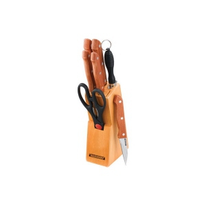 До набору входить: кухарський ніж - 21 см, хлібний ніж 20.5 см, ніж для м'яса - 14 см, ніж універсальний - 12.5 см, ніж для чищення - 8 см, кухонні ножиці - 21 см, гострилка - 29 см, підставка.