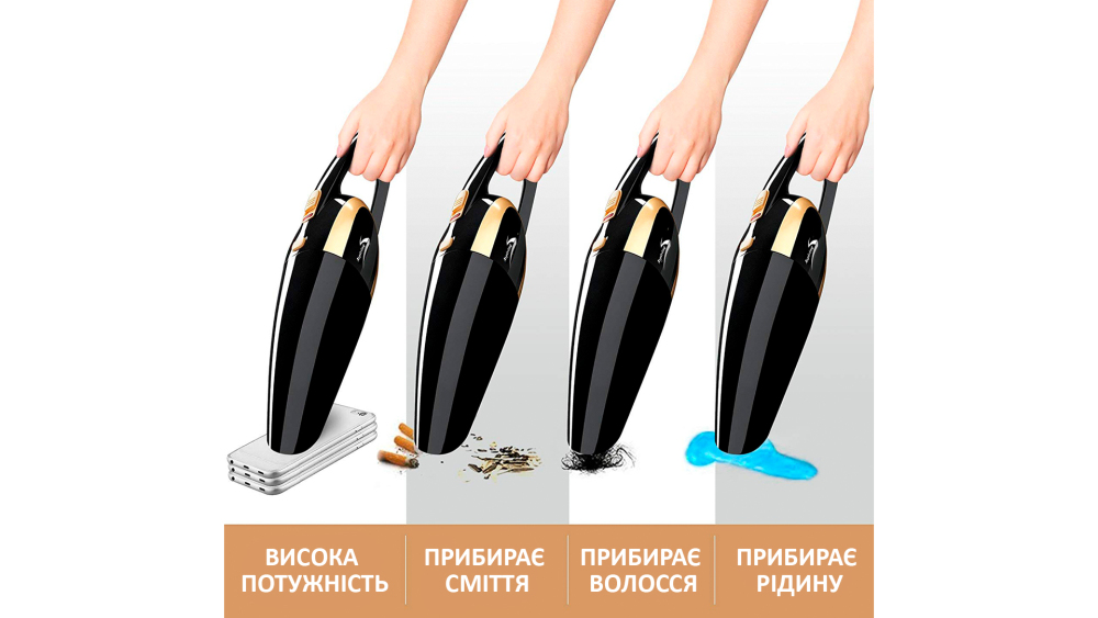 Тип пилососа: електровіник/акумуляторний пилосос, тип прибирання: сухе, збирання води, потужність всмоктування: 100W , акумуляторна батарея 7500mA, об'єм пилозбірника: 0.5 л, тип фільтра циклонний металевий HEPA та HEPA з целюлози, рівень шуму 90 Дб.