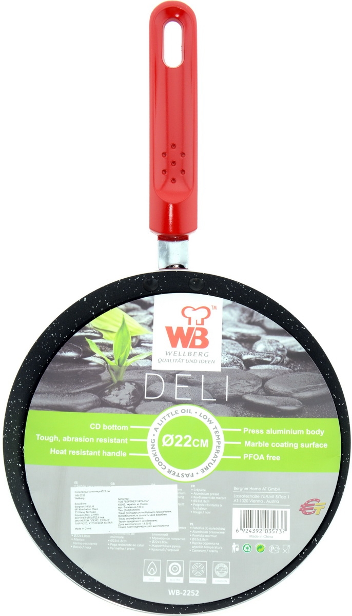 Діаметр: 22см, матеріал: алюміній, 2-шарове мармурове антипригарне покриття, бакелітова ручка, колір: чорний, червоний