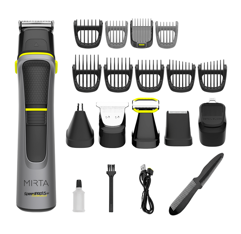 Тример для бороди, вуса, носа, вух, тіла, 15 насадок, регулювання довжини: до 16 мм, потужність 5 Вт, матеріал лез: нержавіюча сталь, комплектація: чохол для зберігання, гребінець, щіточка для очищення і масло, індикатор заряду батареї, акумулятор, розміри коробки: 23,7х15,1х7,4 см