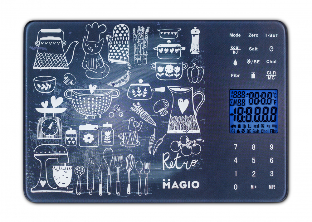 Кухонні ваги MG-692 з гастрономічним малюнком на синьому тлі - чудове доповнення до вашої кухні. Вони не тільки допомагають відміряти потрібну кількість продукту, але і показують його енергетичну цінність.