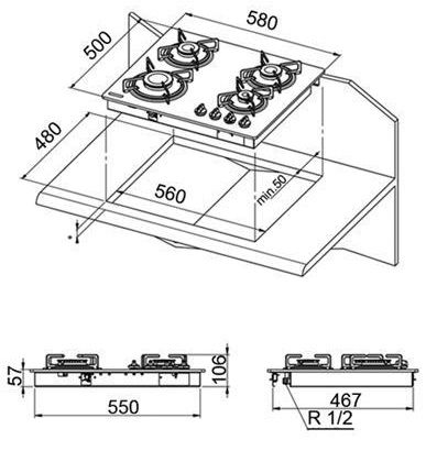 Тип поверхні - газ-на-склі, матеріал поверхні- загартоване скло, розпал - інтегрований, кількість конфорок - 4 газових, матеріал решіток - емаль, електрозапал, газ контроль, колір - чорне скло