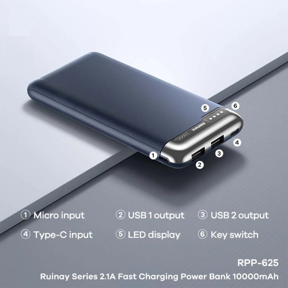 Remax RPP-625 10000mAh резервна батарея має розкішний зовнішній вигляд і досить невеликі розміри лише 140 x 69,5 x 16 мм і вагу лише 220 г.